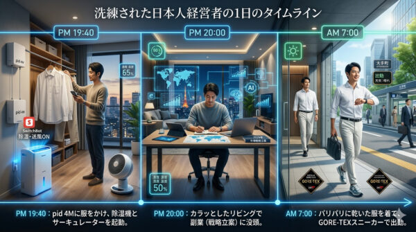 そして、書斎のデスクで明日の経営戦略や数字のチェックに取り掛かろうとした瞬間、部屋中に充満した湿気と、部屋干しした服から漂う「生乾き臭」に襲われ、完全に集中力が途切れる……。